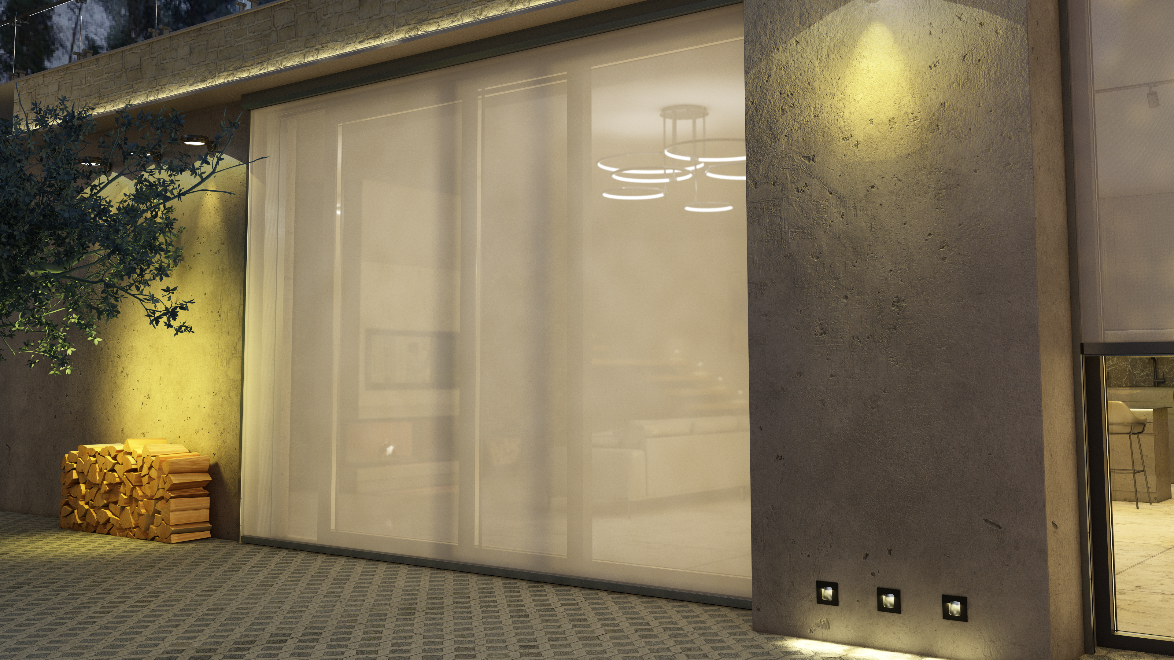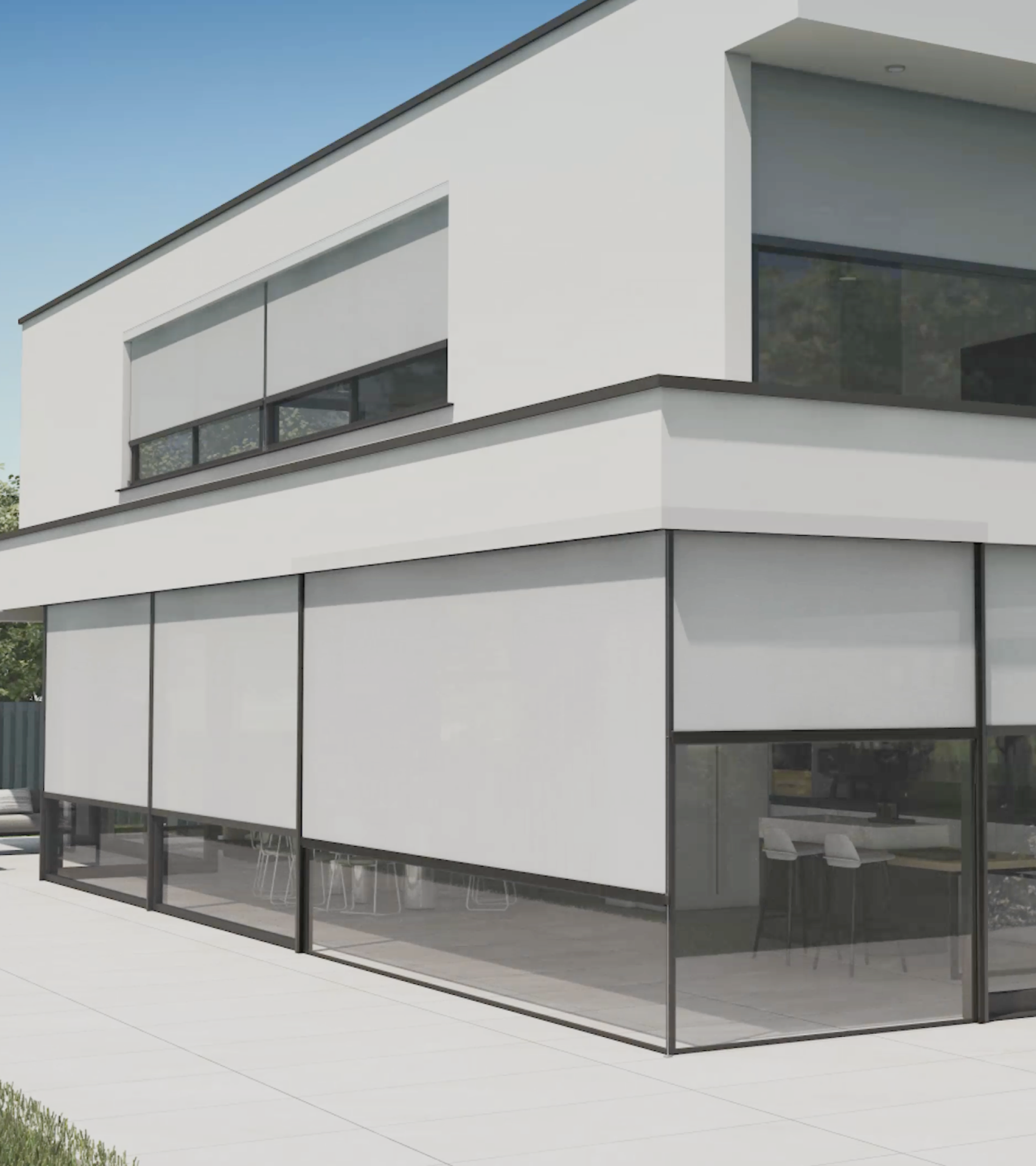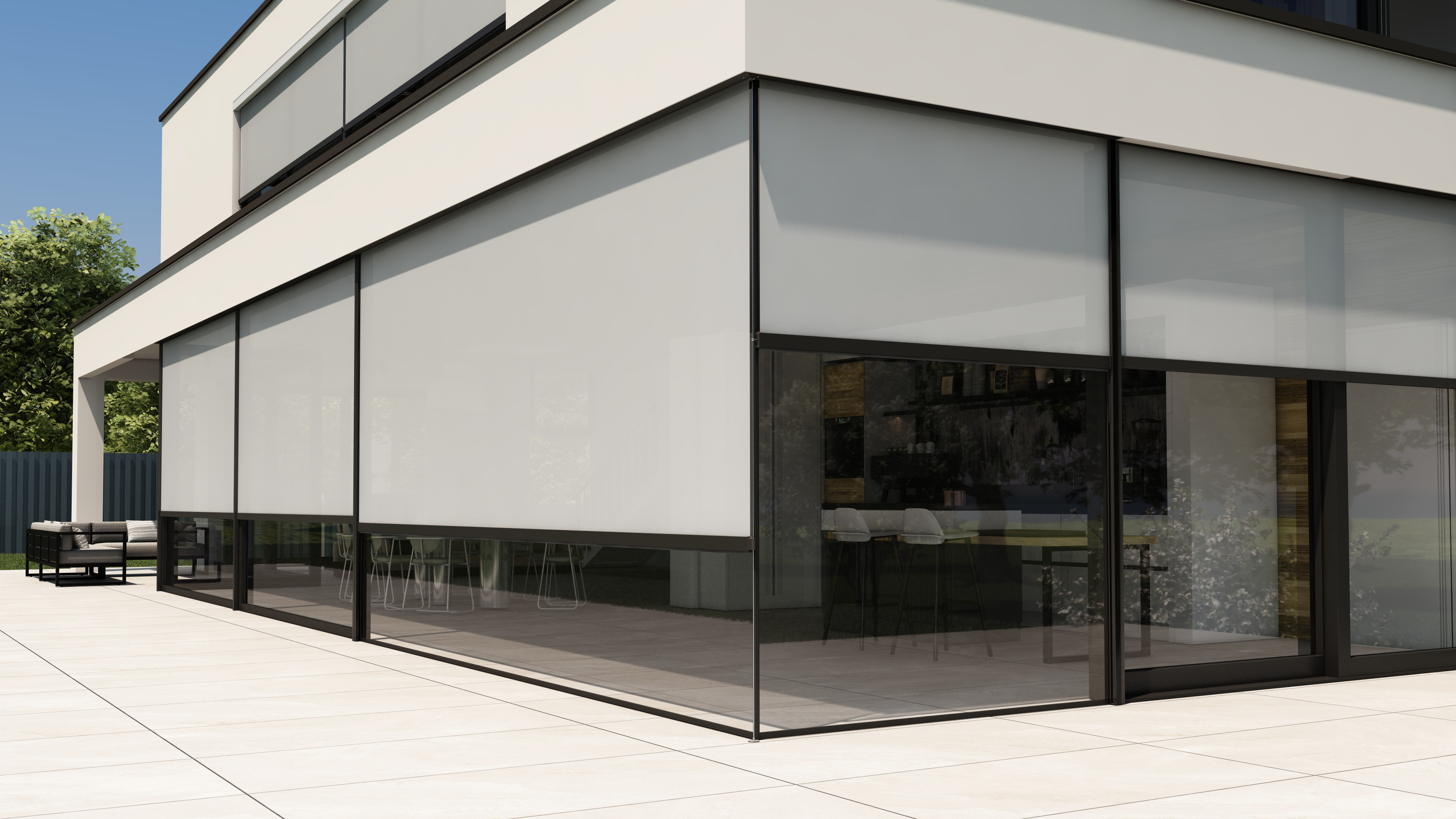 The system consists of two curtains, which are connected in the corner part of the building by a stainless steel cable, and on the sides by guide rails with zip lock technology. The systems are controlled independently of each other thanks to separate end slats.