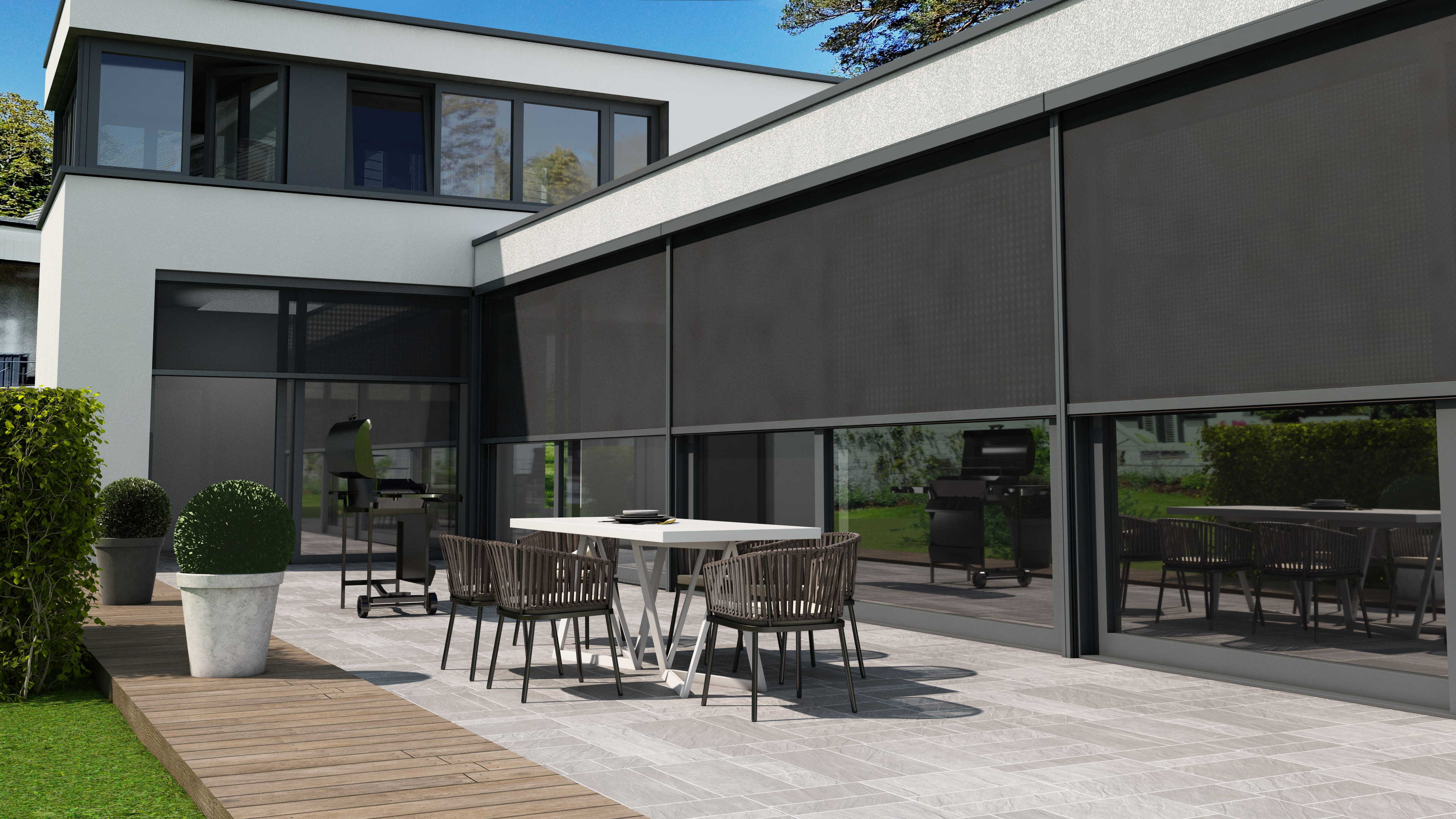 The special fabric is directly integrated into the guide rail without a zip lock mechanism. This type of system is the optimal solution for regions with low wind loads and provides effective protection against sunlight.